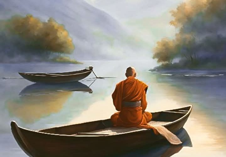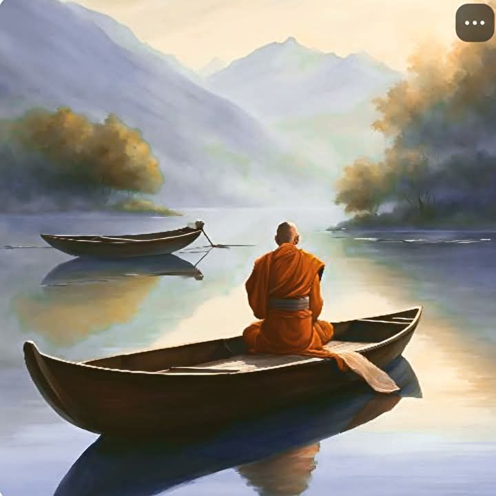 Toma una barca en el lago que está frente a su monasterio, cierra los ojos y se pone a meditar.